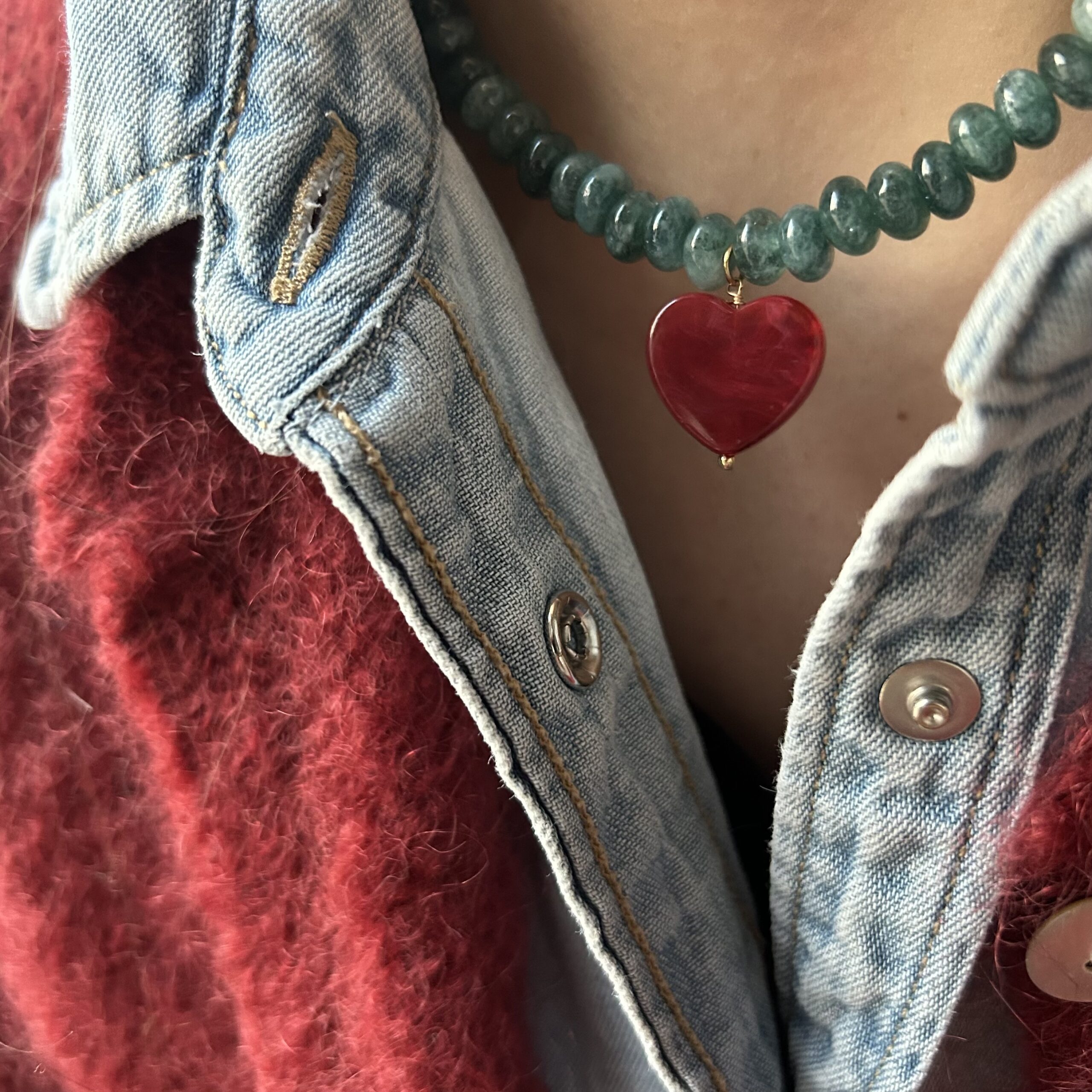 Collier jade vert/coeur bordeaux